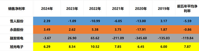盈利能力:旭光电子>永鼎股份>雪人股份>融发核电