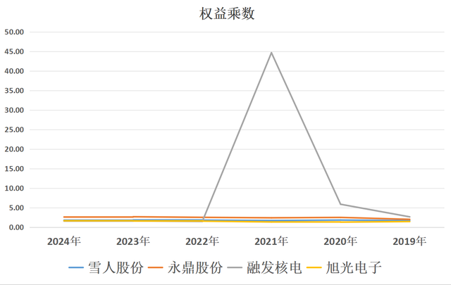 权益乘数:永鼎股份>雪人股份>旭光电子>融发核电