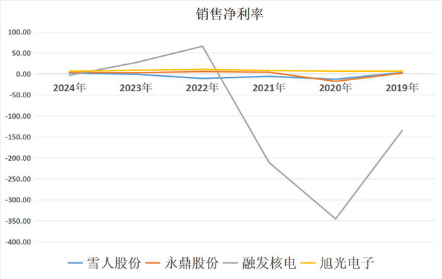 由于融发核电在过去五年出现了大幅亏损,所以,其他三家公司的净利率曲线被压缩得比较窄。