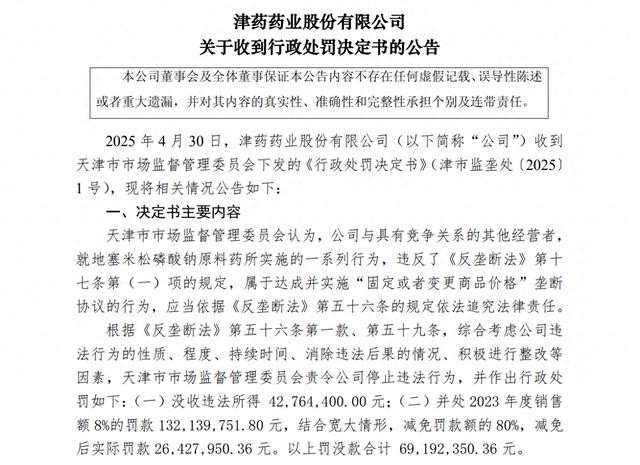4月30日,津药药业也发布收到《行政处罚决定书》的公告,被没收违法所得4276.44万元;并被处2023年度销售额8%的罚款1.32亿元,结合宽大情形,减免罚款额的80%,减免后实际罚款2642.8万元。合计罚没金额为6919.24万元。